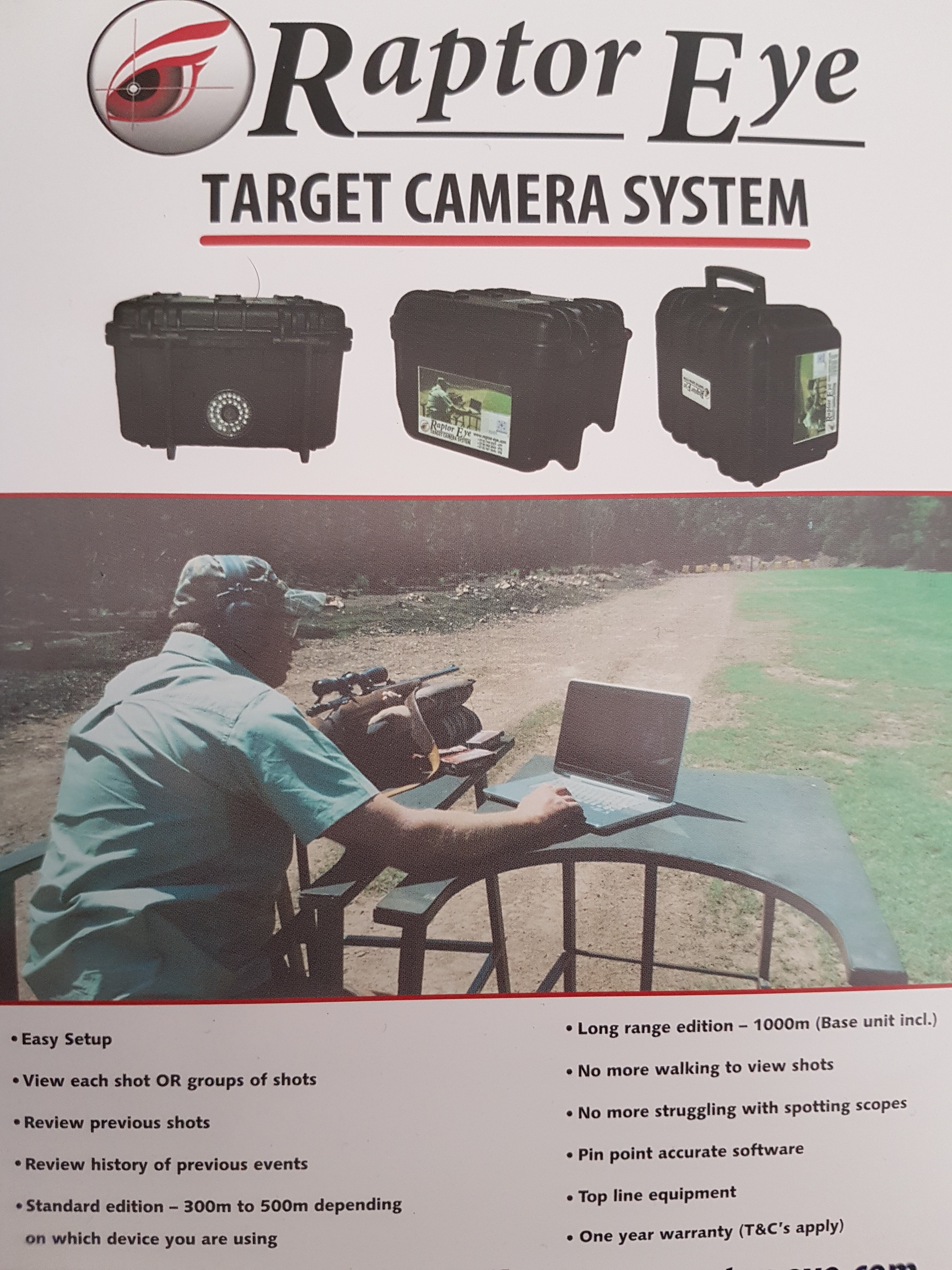 Our target camera is setup down range at your target and you can then view each and every shot fired to your target on your laptop or handheld device from your shooting station. No more walking up and down to view your shots. No more struggling to view your shots with a spotting scope. Saving you time and money. Each shot fired is indicated by a blinking indication where your last bullet has entered the target. Please vissit our website at www.raptor-eye.com for more details on our product.